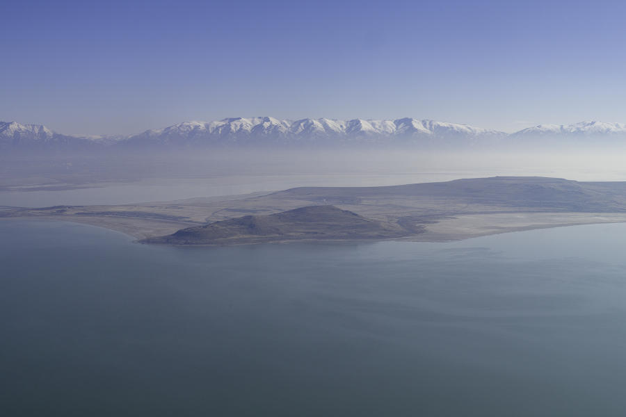 Aerial View of the Great Salt Lake, Antelope Island and the Wasatch Mountains Obscured by the Pollution Inversion.